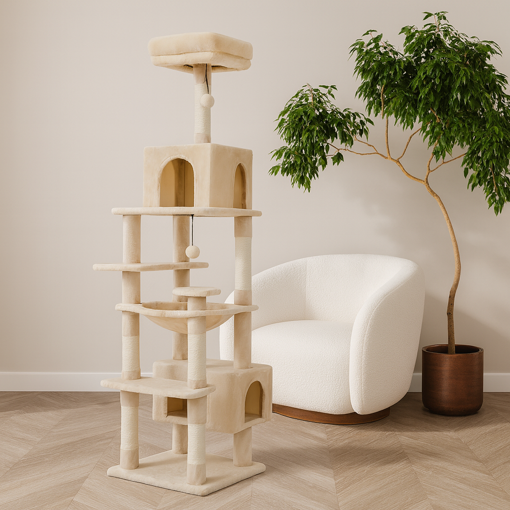 Geef je kat(ten) het ultieme koninkrijk met het KattenKasteel! Deze meerlaagse krabtoren biedt alles wat een nieuwsgierige klimmer, dromer of speelkameraad nodig heeft.